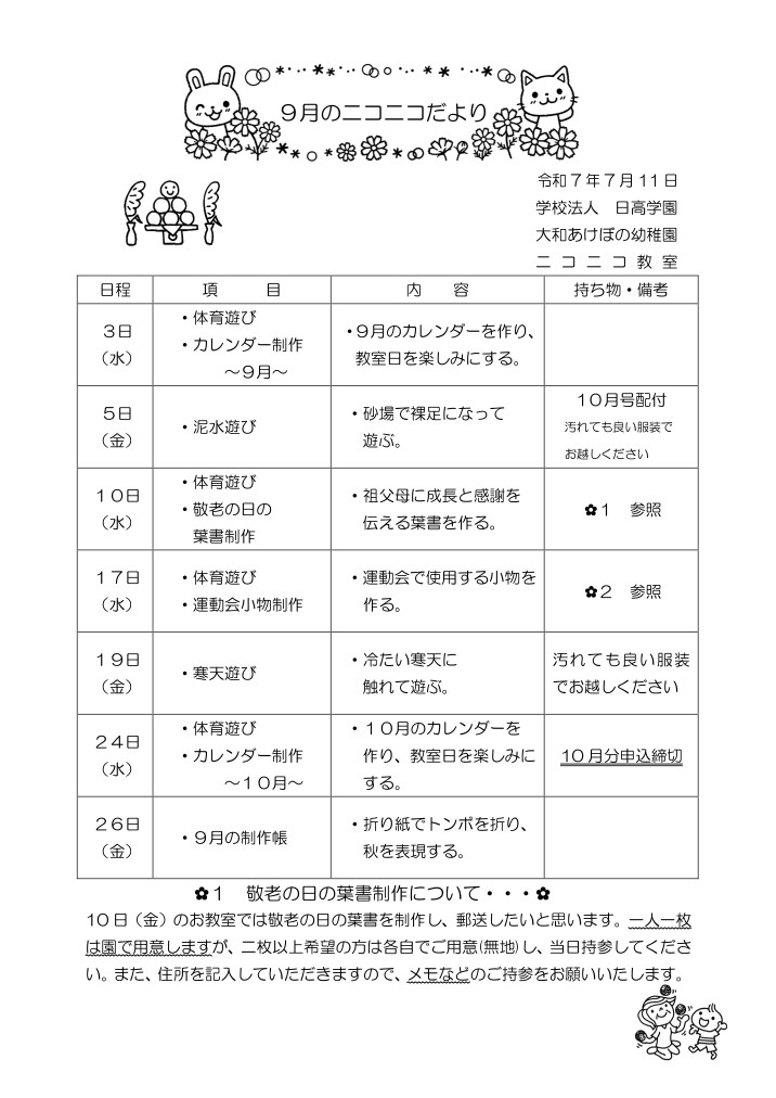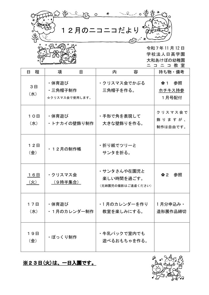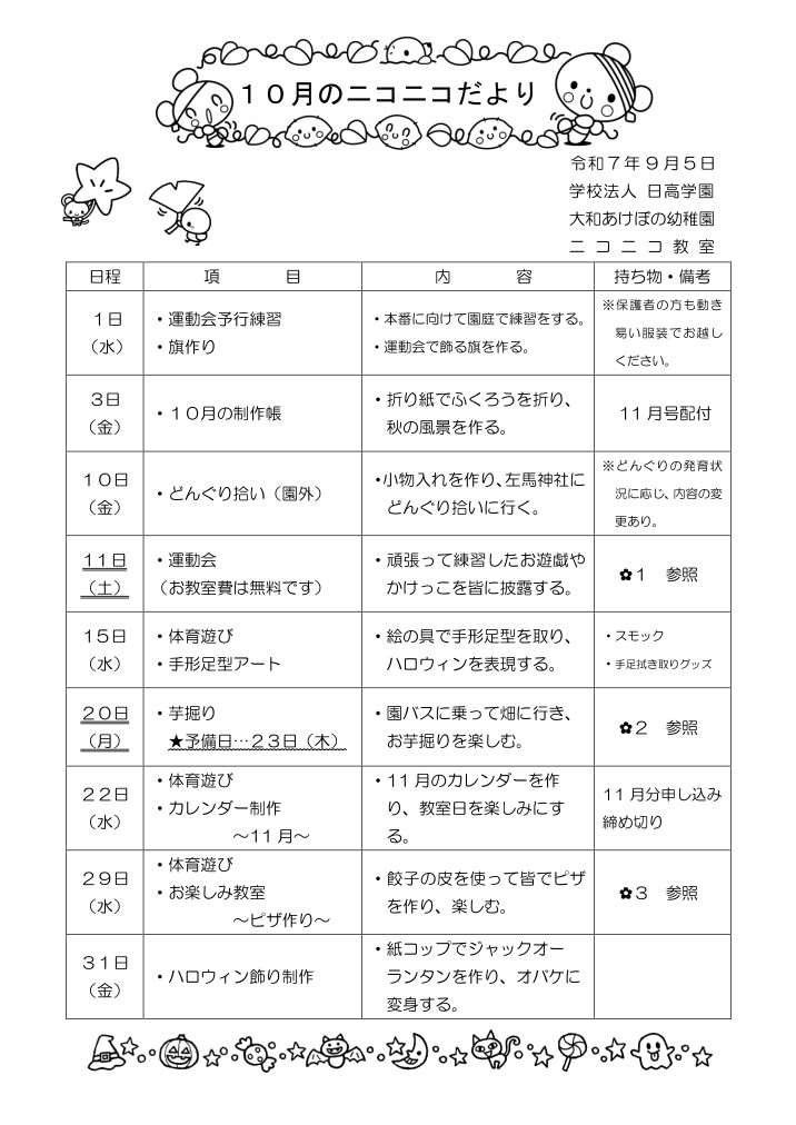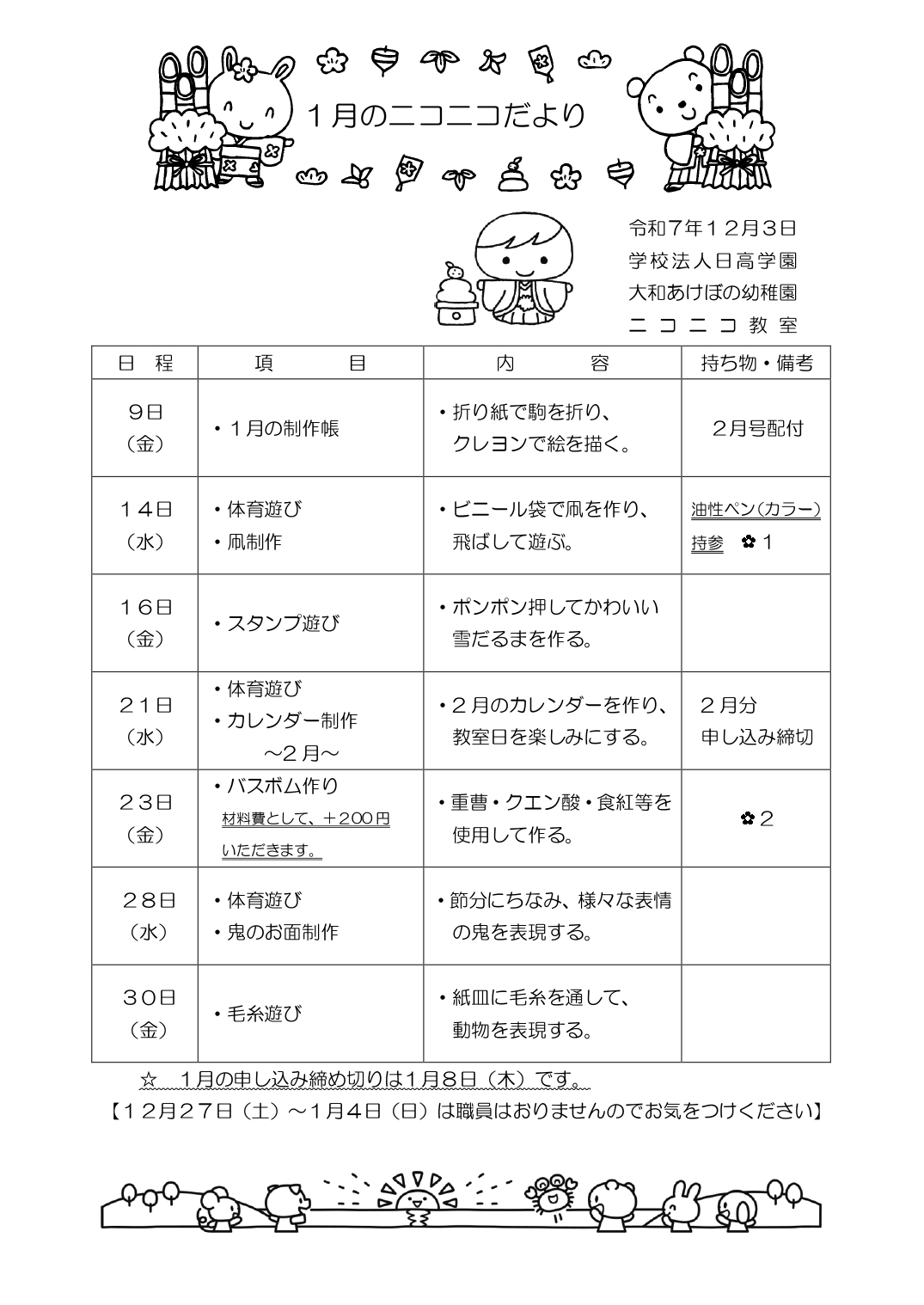 この時期は、自分一人で実行しようという意欲も芽生え、複雑な行動力も身についてきます。歌・踊り・絵画・粘土・組立て等の活動も活発になってきます。また、記憶力も発達する時期です。このような大事な幼児期に週に1、2度幼稚園で同年齢のお友だちと仲よく遊べる集団生活の術を習得する教室として、ニコニコ教室を開催しています。