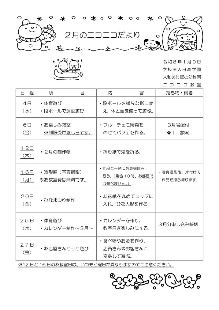 ニコニコ教室 月間予定表